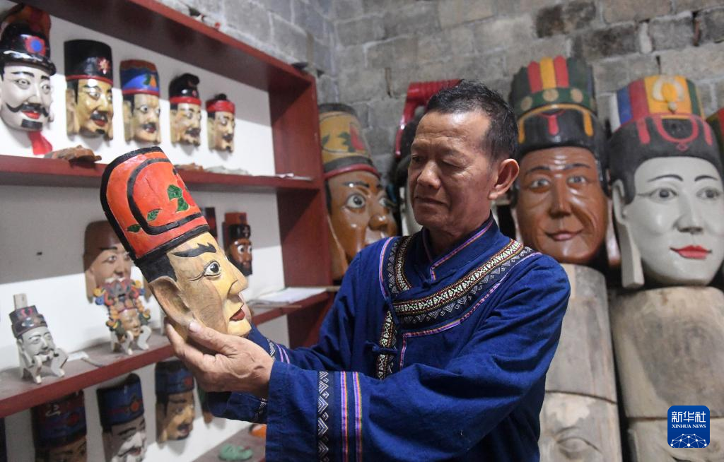 在环江毛南族自治县下南乡南昌屯,谭建新展示自己雕刻的毛南族傩面(5月11日摄)。